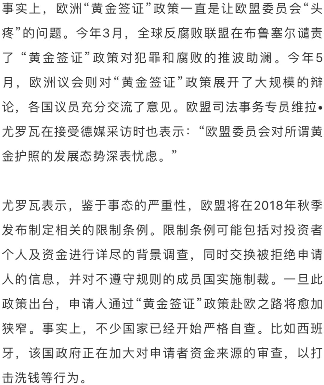 目前,欧洲“黄金签证”在移民市场上一直人气十足,外籍人士只需购买房产或投资国债等方式即可获得某个欧洲国家的居留许可,甚至公民身份,这样简单、快捷的移民方式自然备受投资人追捧。然而最近一段时间,欧洲“黄金签证”政策似乎成了人人喊打的“过街老鼠”,引发了越来越大的争议。